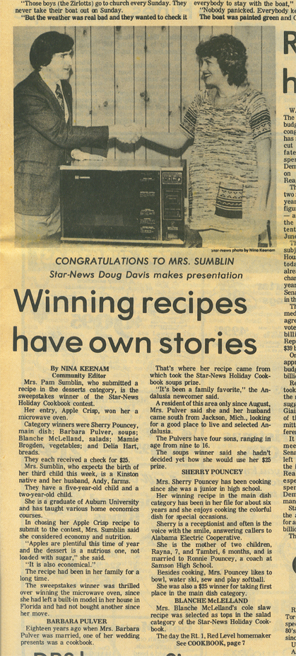 I am so happy my sister, Maggie, found this article at my grandmother’s house. I remember this day like it was yesterday. It was 30 years ago…. I was 5 years old. Mom made her Apple Crisp for a local recipe contest. She won! My mom winning was very, very exciting to a 5 year old. Not only did she win $25 (wow… wonder what we did with that!?!) she won a microwave oven. I love the “oven” part that most of us have dropped over time. This microwave stayed in our kitchen until I was in late college… approximately 16 years. I can still see the turn dials and numbers that flipped like an old school alarm clock. What luck! Mom is in town for thanksgiving and we are going to make the apple crisp. I will show the step by step process and the recipe on Thursday. I hope you and your family enjoy it as much as we have over time.